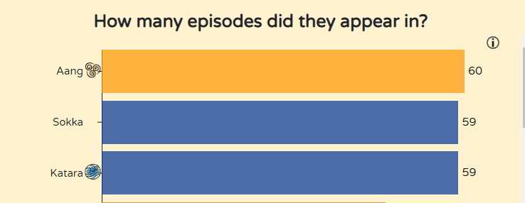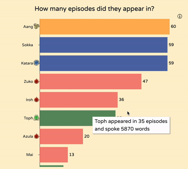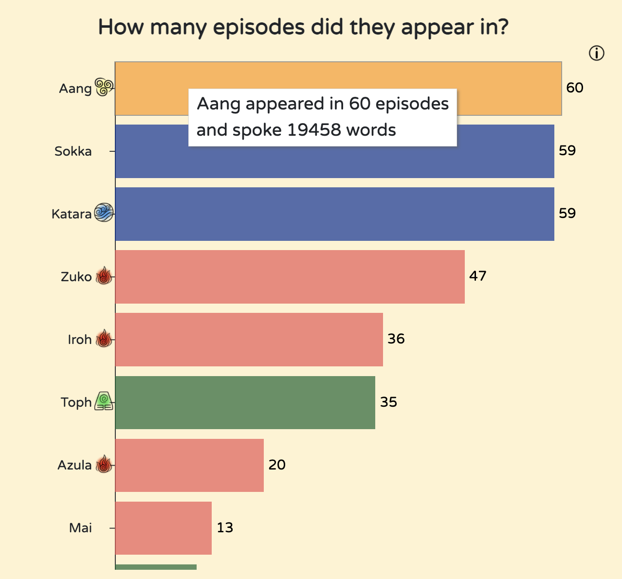 The bar chart displays how many episodes each character had at least one line in, sorted by characters with the most screentime. Next to the character name is a symbol of their nation if they are a bender.