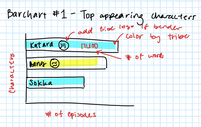 This mockup was our first idea of what the barchart woud look like. We ended up having to change some of the design, such as the placement of the bender symbols. While we wanted it to be inside the bar itself, some bars were too small to contain the symbol. Therefore, we put it near the tick instead, where there would be enough space. The coloring scheme was based on the nationality of the character (Fire, Water, Earth, Air). This is similar to the pie chart, with the same color scheme (specifically earth - #063, water - #039, fire - #e55, air - #FF9900, non-national - #9932cc).