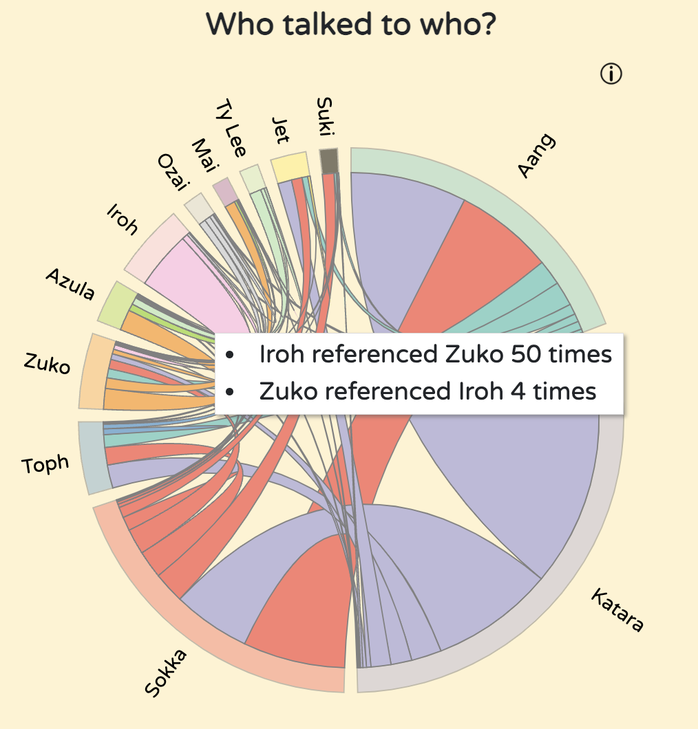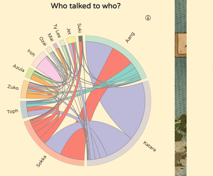 Viewers will notice very strong connections between Aang, Katara, and Sokka, as well as between Zuko and Iroh (who travel together throughout nearly all of the series). We included this visualization because we believe it highlights the strength of relationships or bonds between characters effectively.