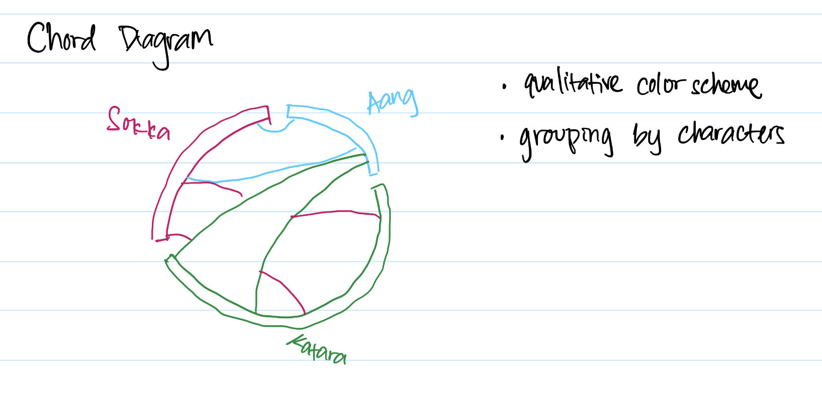 This mockup was created with the main 3 characters in mind. In this simple design, we knew we had to use qualitative color scheme since we had to be able to individually identify the characters and who they talk to. We ended up using the top 12 characters in the show, which is probably the maximum number of characters, otherwise it would be too cluttered.