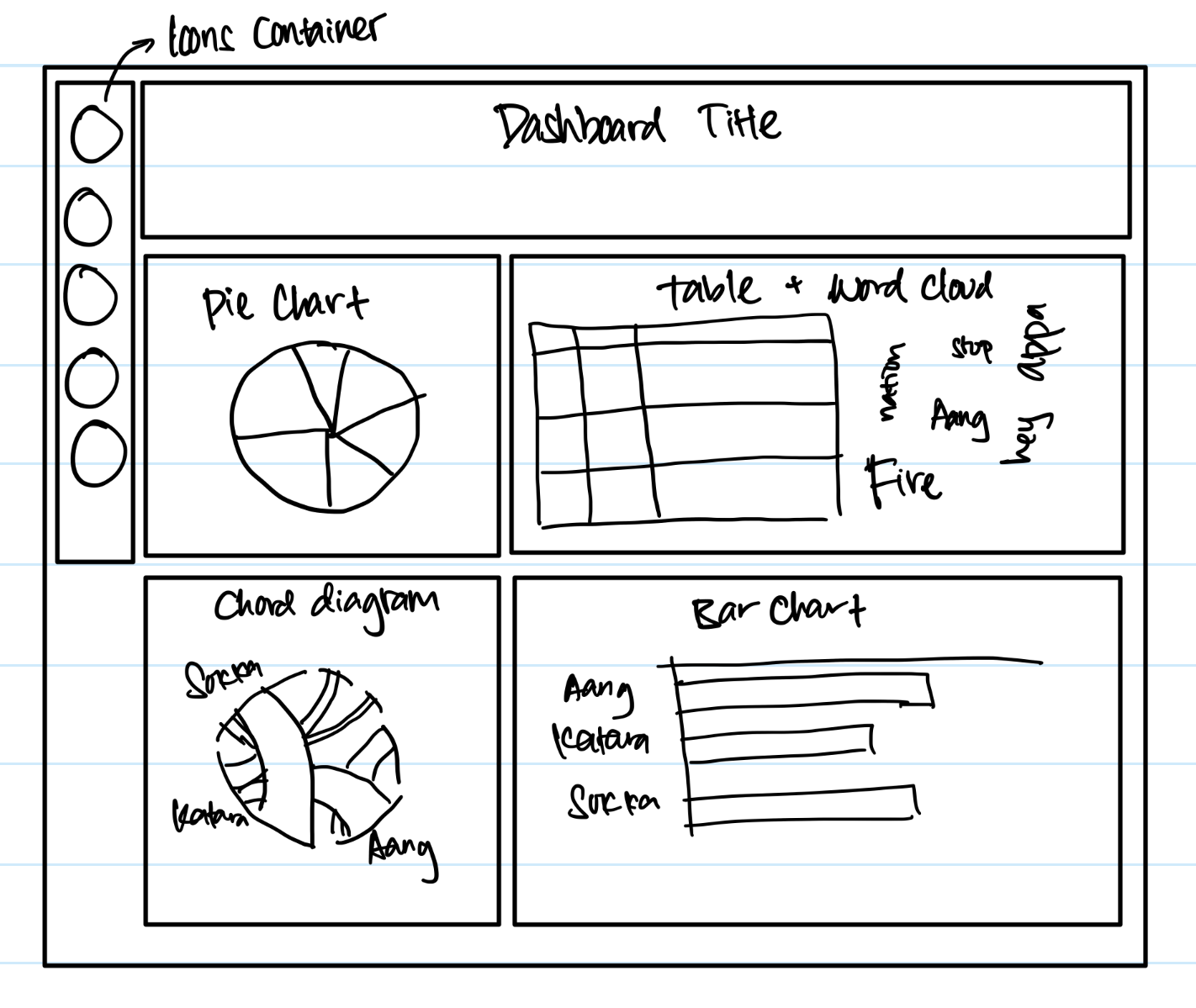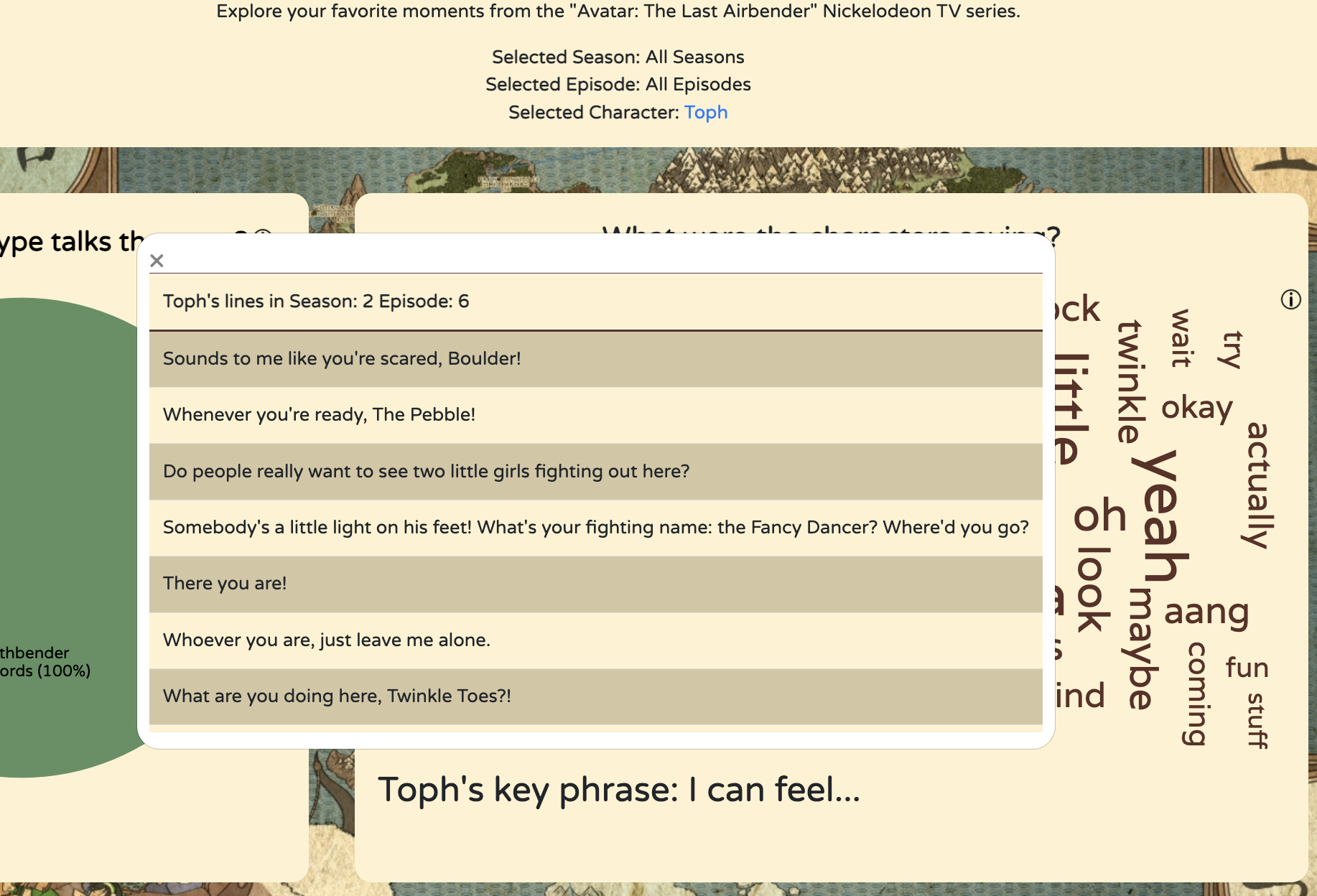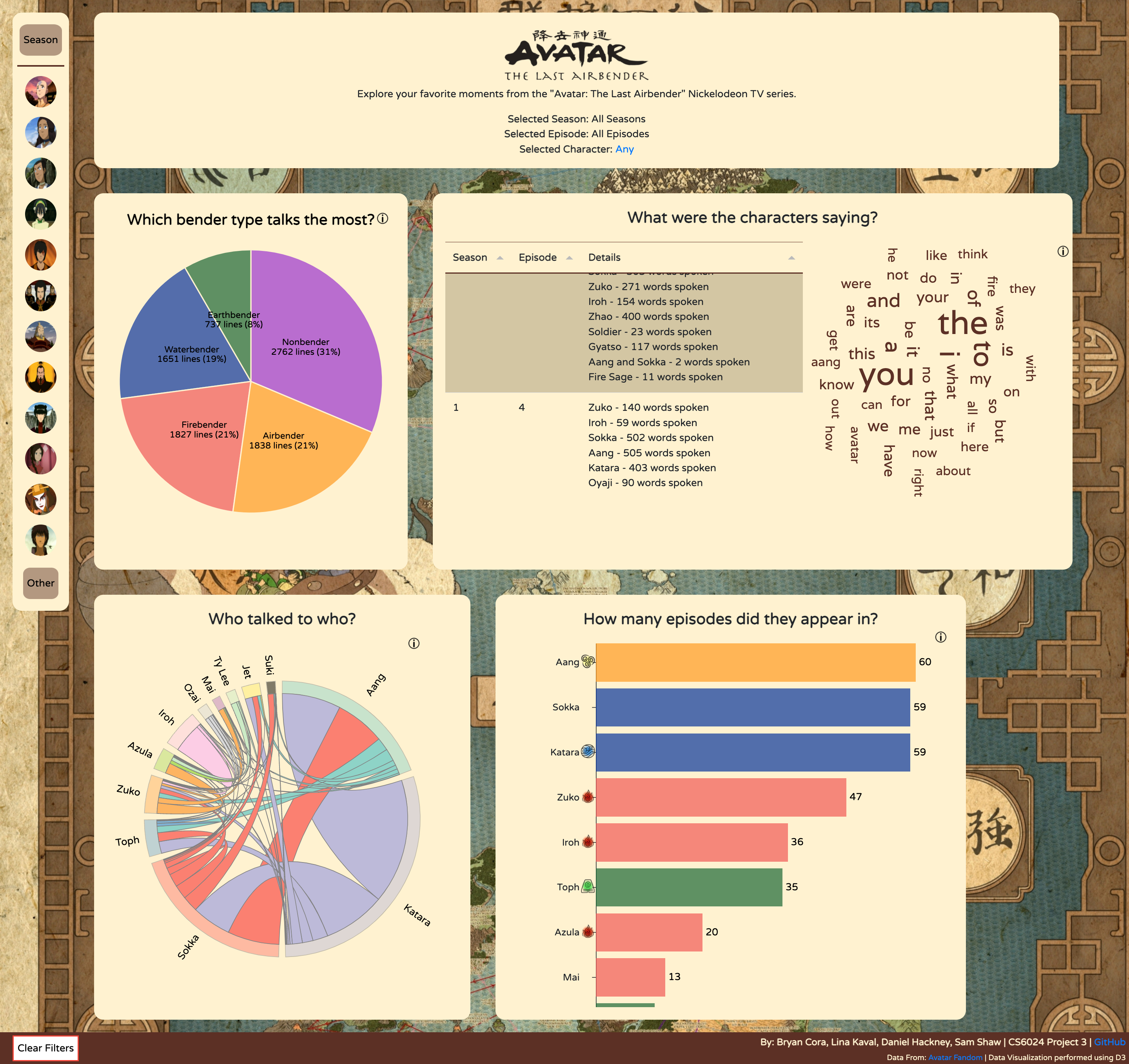 As fans of the show Avatar: The Last Airbender, my team decided to delve deeper into the realm of the Fire Nation's reign. Users can view information about which bender type talks the most in the show, what the main characters were saying, who talked to who, and the number of episodes the characters appeared in, in one simple visualization. We used plenty of imagery from the show to make it even easier for fans to navigate.