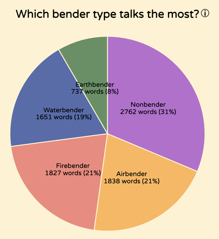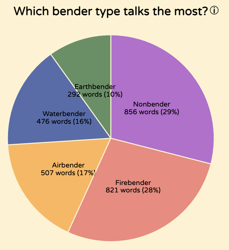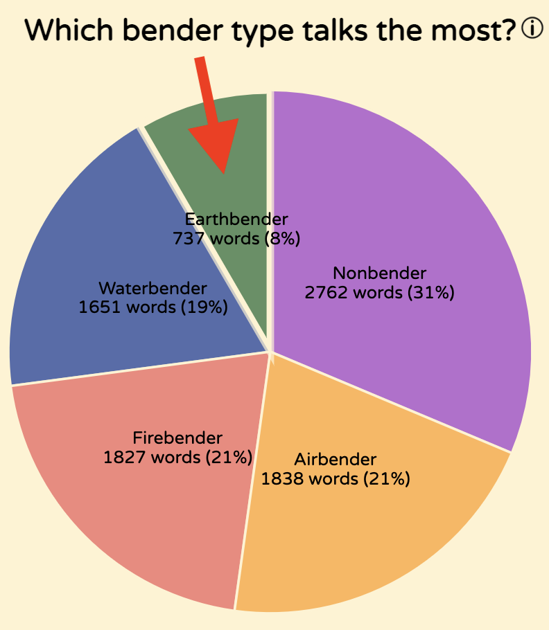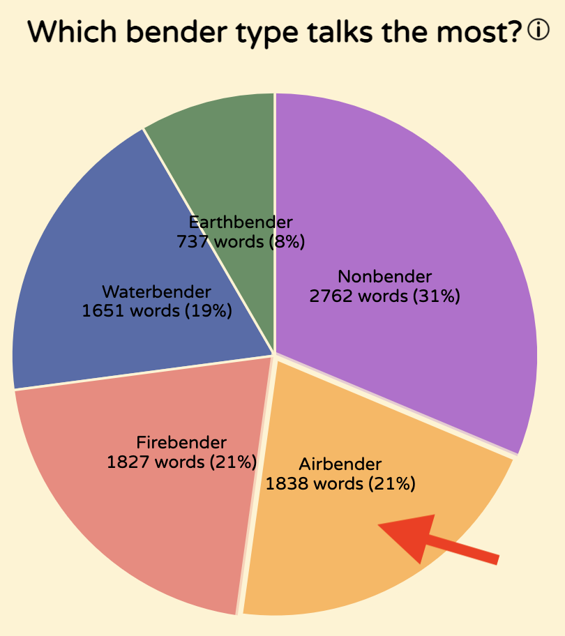 Also, related to the pie chart, it is worth noting that Aang - the only airbender with a significant proportion of dialog - speaks more lines than all of the main firebenders in the series combined.