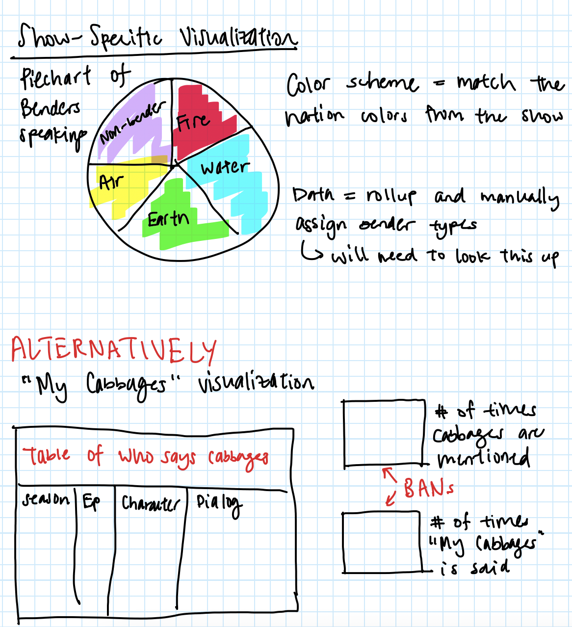 We wanted to focus on the unique aspects of our show - benders are an easy to understand yet unique part of the show. We thought we could make a simple visualization with the benders and how often they speak.
