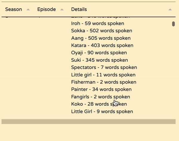 Additionally, once a character is selected, clicking on the row allows the user to see all of the character's lines from that episode. A popup appears with another table containing all of the lines from the episode.