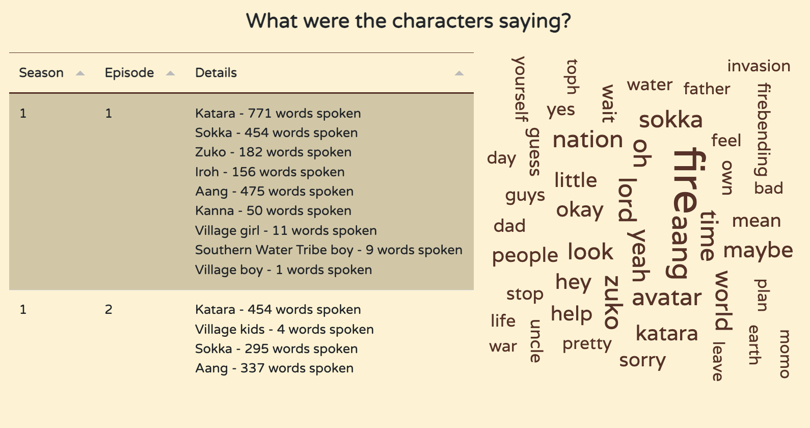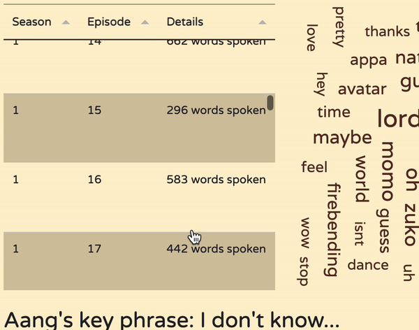 When a character is selected, the table updates to show only the episodes in which they appeared. The reason why we placed this next to the word cloud is because the word cloud will also update - this will be covered later.