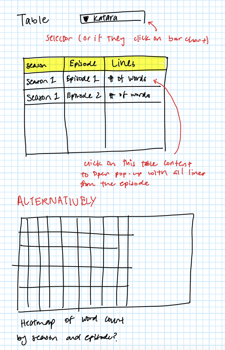 The mockup was created while thinking about the requirements of what we had to show. The word cloud would show the words spoken by character but we still needed a way to be able to view the character's lines by season and episode.