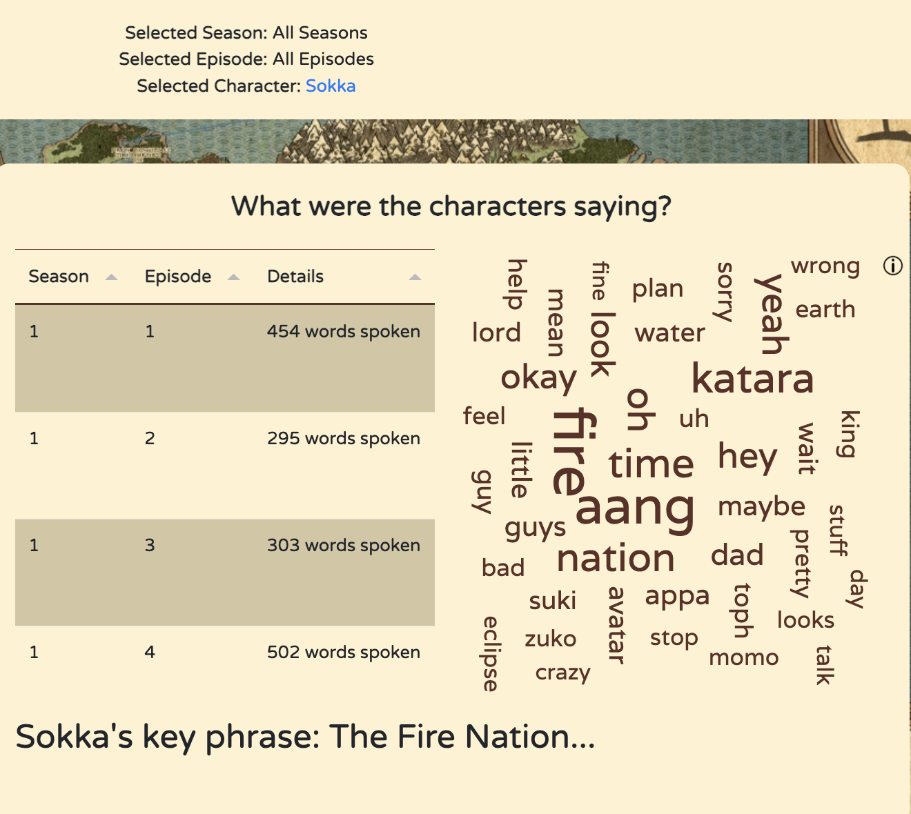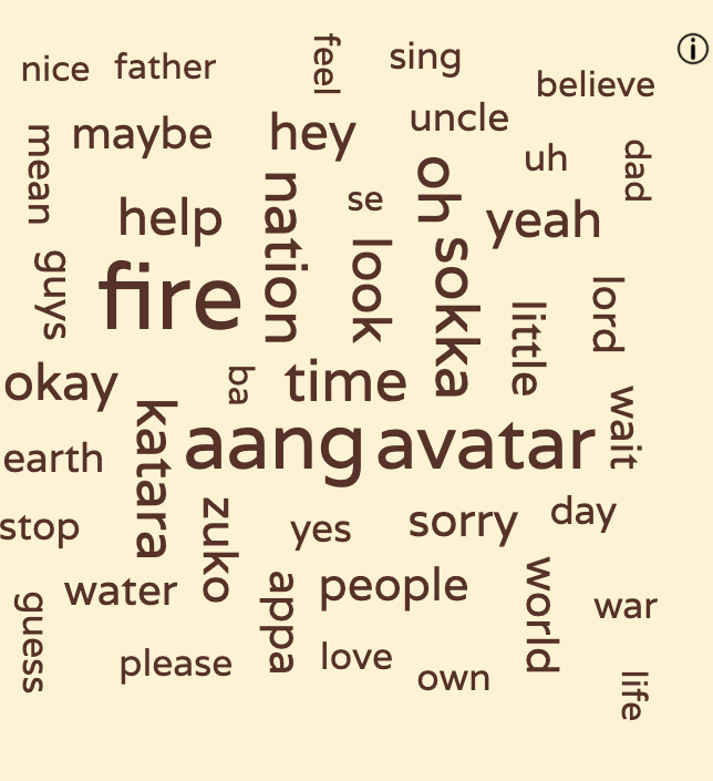 Additionally, choosing a character will filter the word clouds to only words spoken by that character. Pictured: filtering based on Sokka